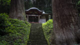 野太い鳥居のように立つ2本の大イチョウ。それほど広いわけでもない道の中にあってより大きく感じさせる。葉が色づいている頃合いはまだ参拝していないが、調べてみると空が埋め尽くされて見えないほどの迫力。左側は数十年前に落雷によって身をえぐられるも新たな樹木が成長しているという。