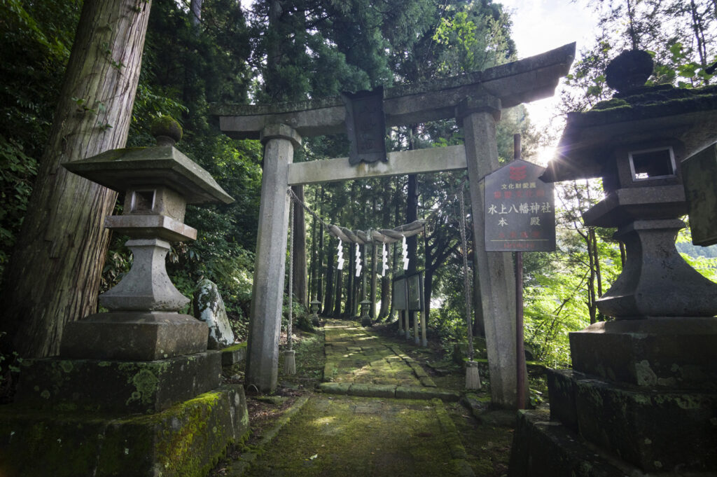 かつて村の西南にある宇幣山・龍頭ヶ池のほとりに、水の神を祀る水上宮として鎮座していた。延長年間 (923〜931年) に、石山の大杉 (南に1km強) のそばへ遷座される。寛治年間 (1087〜1094年前) には、源義家が氏神である石清水八幡宮を勧請し、合祀して新八幡宮と称された。安貞年間 (1227〜1229年)、現在の神楽館の地に社殿が造営され、「水上正八幡宮」と呼ばれるようになり、武運と農耕の守護神として信仰されてきた。天正・慶長の戦乱により古記録や宝物は失われたという。元和八年 (1622年) には、酒井忠勝の入国後代々の祈願所として社領三百五十束が寄進され、社殿の修理が行われた。
