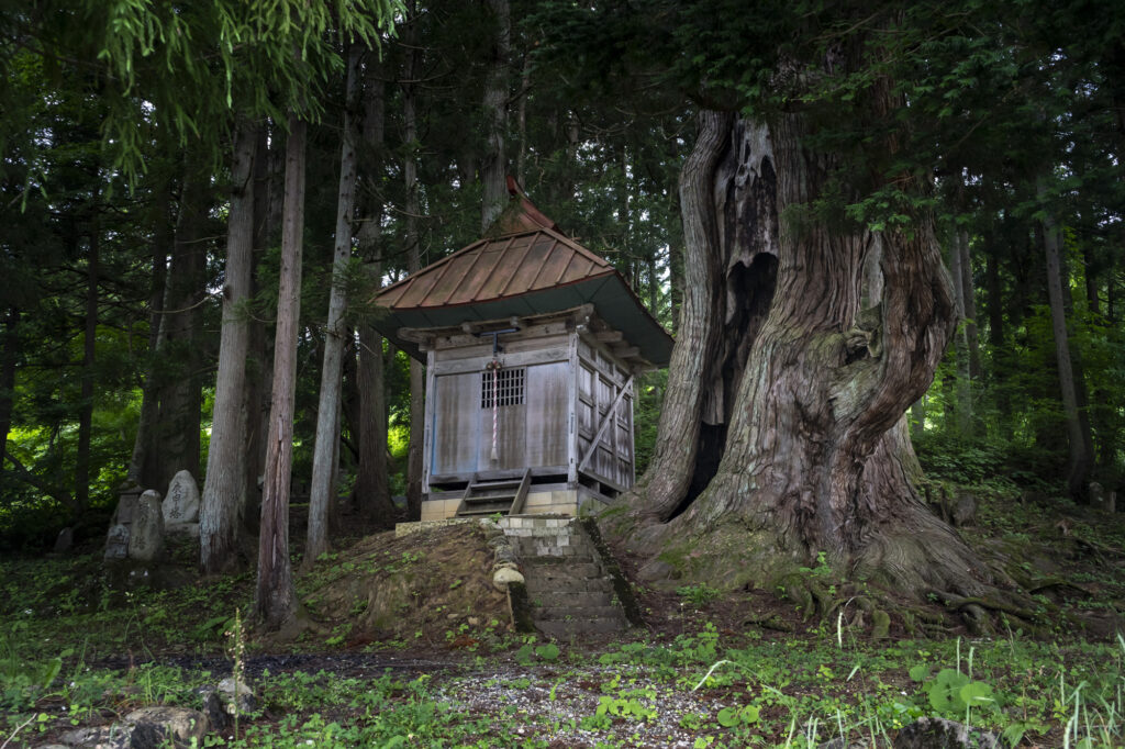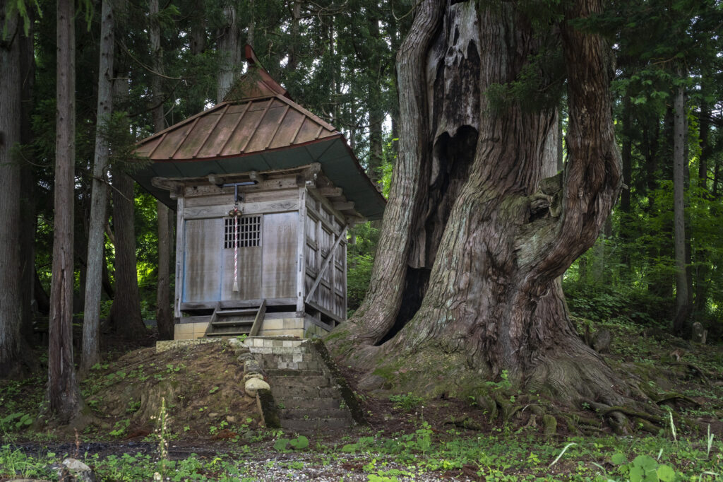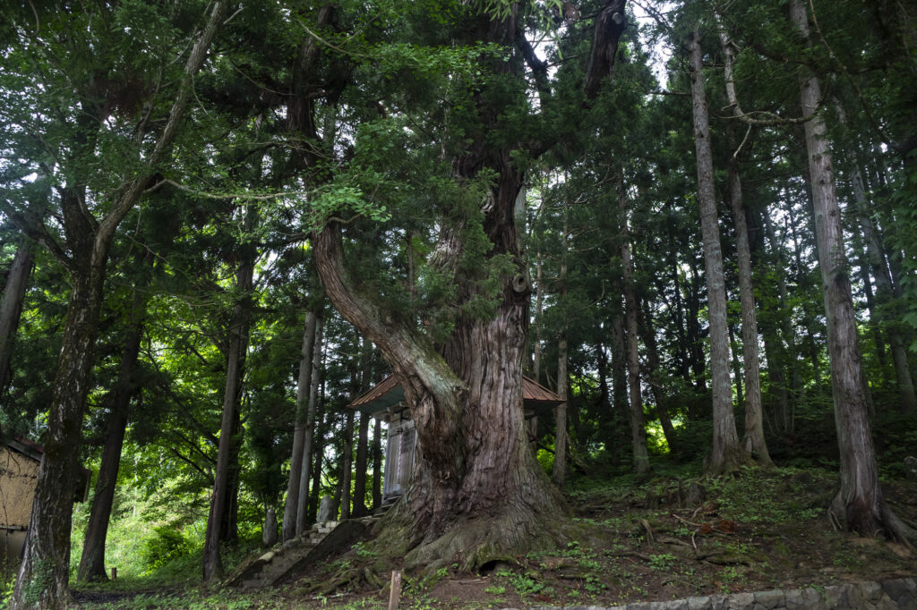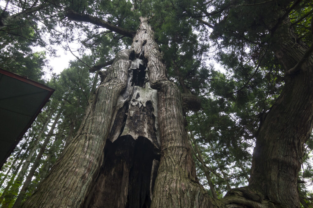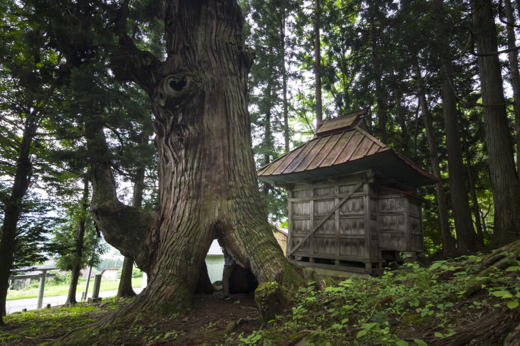 目を引く巨大な杉の木は幹回り12mで、長野県の天然記念物に指定されている。人一人くぐって通過できるほどの空洞があるが弱っているようには見えない。