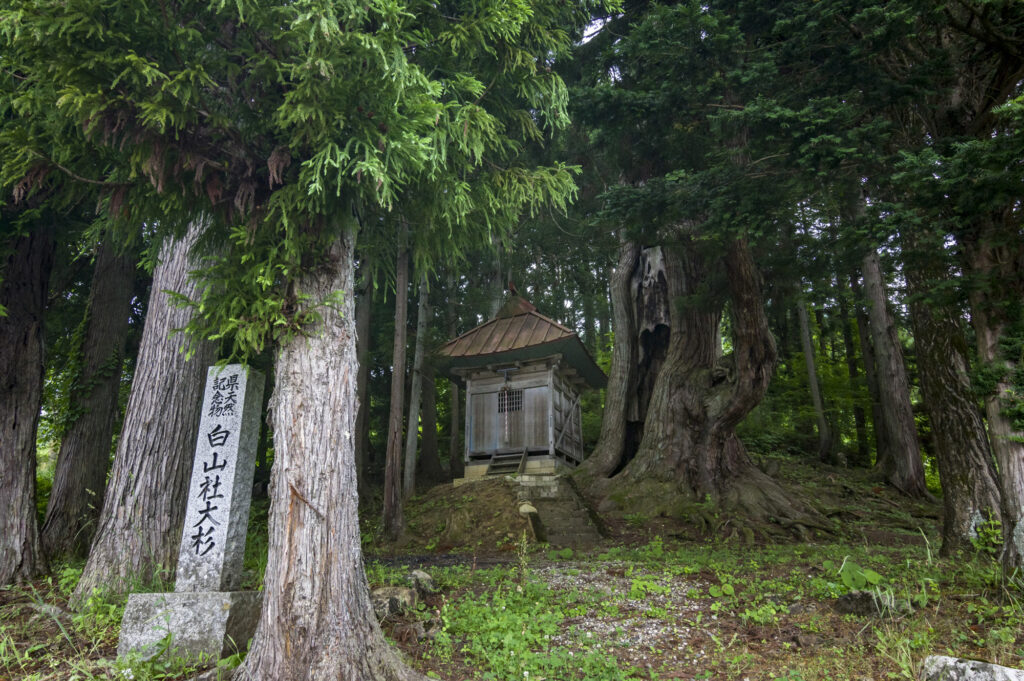 「白山社大杉」という標の奥に社殿と巨人の姿が見える