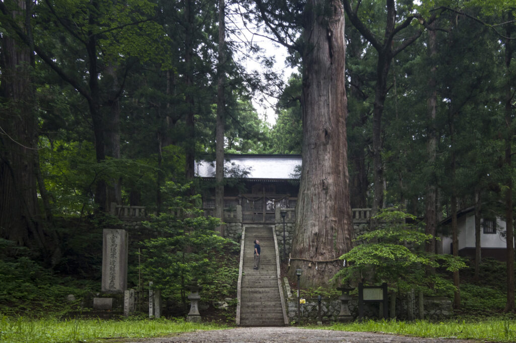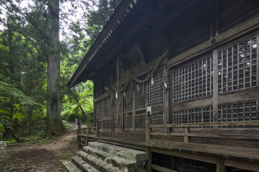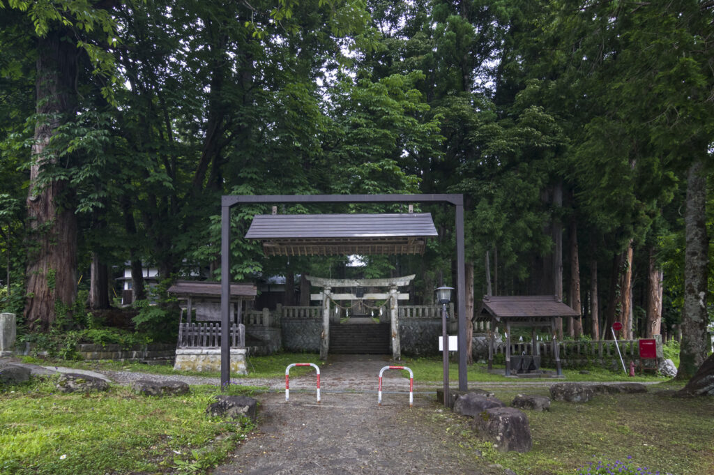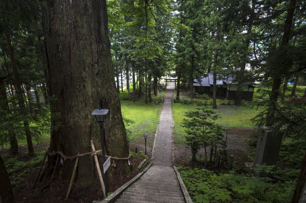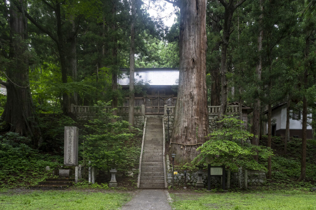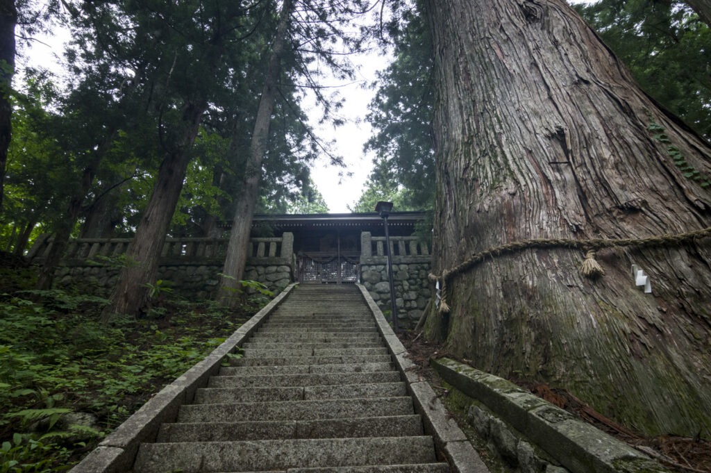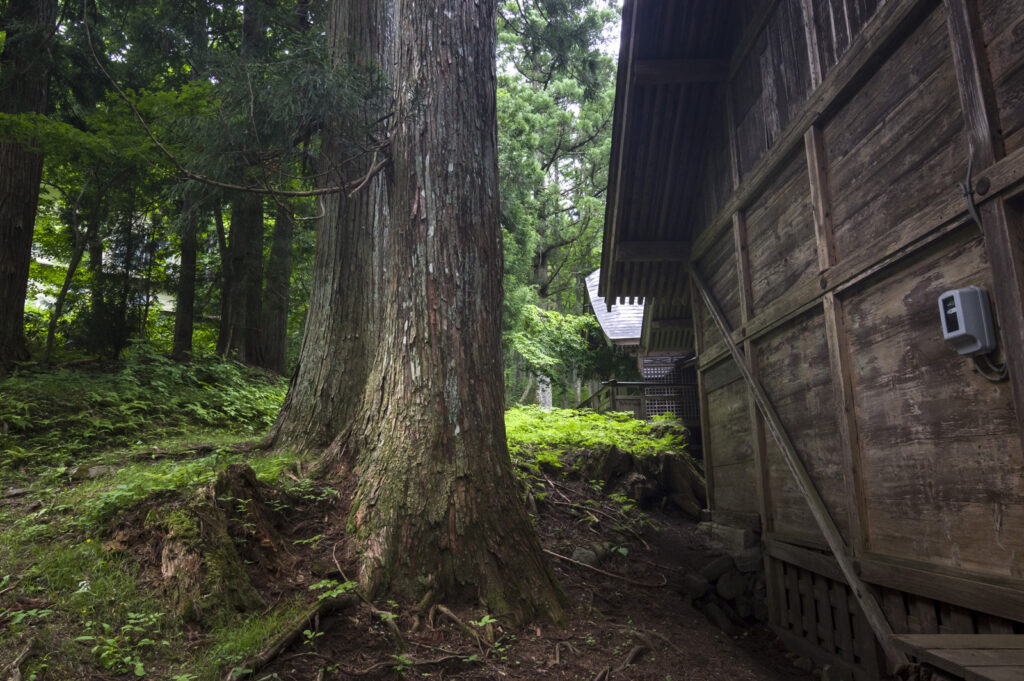 村の天然記念物に指定されている大杉は白馬最大の巨杉で幹回り10m超えの巨大一本杉である。東京都の養沢五柱神社の杉を想起させる円錐型で根元が迫力満点である。先述の八田弥五兵衛が創建と同じ年に献木したと伝承があるため樹齢は800年以上ということになる。推定樹齢は1000年余りという記述もある。
